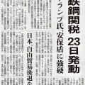 本日は朝日新聞朝刊から、「米鉄鋼関税 23日発動(2018年3月10日版 [48947号] 13面)」の記事をオススメします。