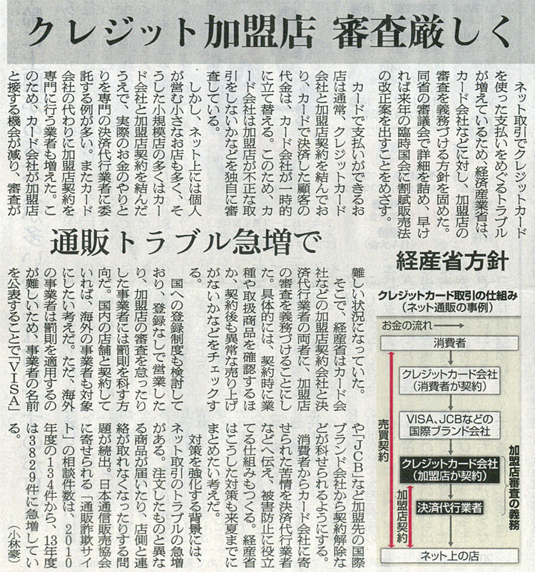 本日は朝日新聞朝刊より「クレジット加盟店 審査厳しく」の記事をオススメします。