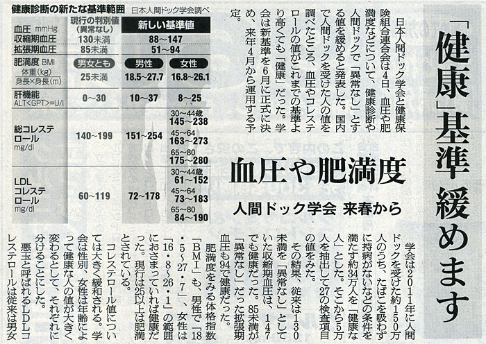 本日は朝日新聞朝刊より「『健康』基準 緩めます」の記事をオススメします。