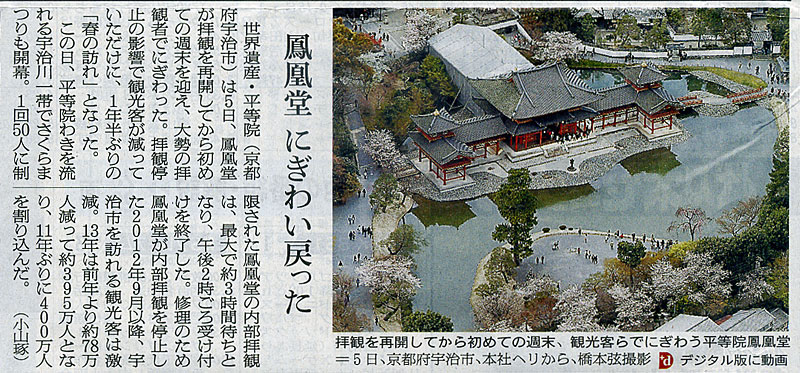 本日は朝日新聞朝刊より「鳳凰堂 にぎわい戻った」の記事をオススメします。