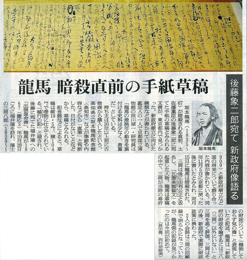 本日は朝日新聞朝刊より「龍馬 暗殺直前の手紙草稿」の記事をオススメします。