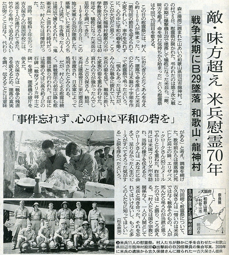 本日は朝日新聞朝刊より「敵・味方超え 米兵慰霊70年」の記事をオススメします。