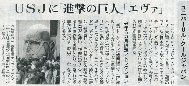 本日は朝日新聞朝刊より「UFJに『進撃の巨人』『エヴァ』」の記事をオススメします。
