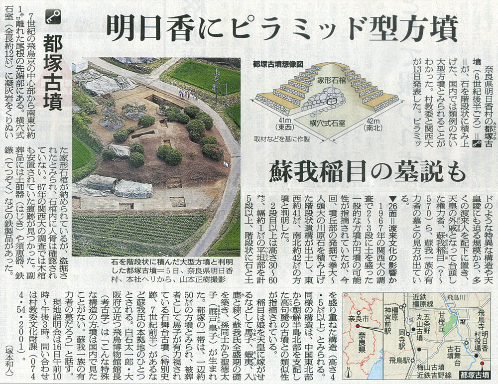 本日は朝日新聞朝刊より「明日香にピラミッド型方墳」の記事をオススメします。