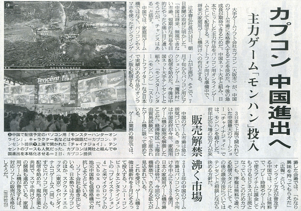 本日は朝日新聞朝刊より「カプコン 中国進出へ」の記事をオススメします。