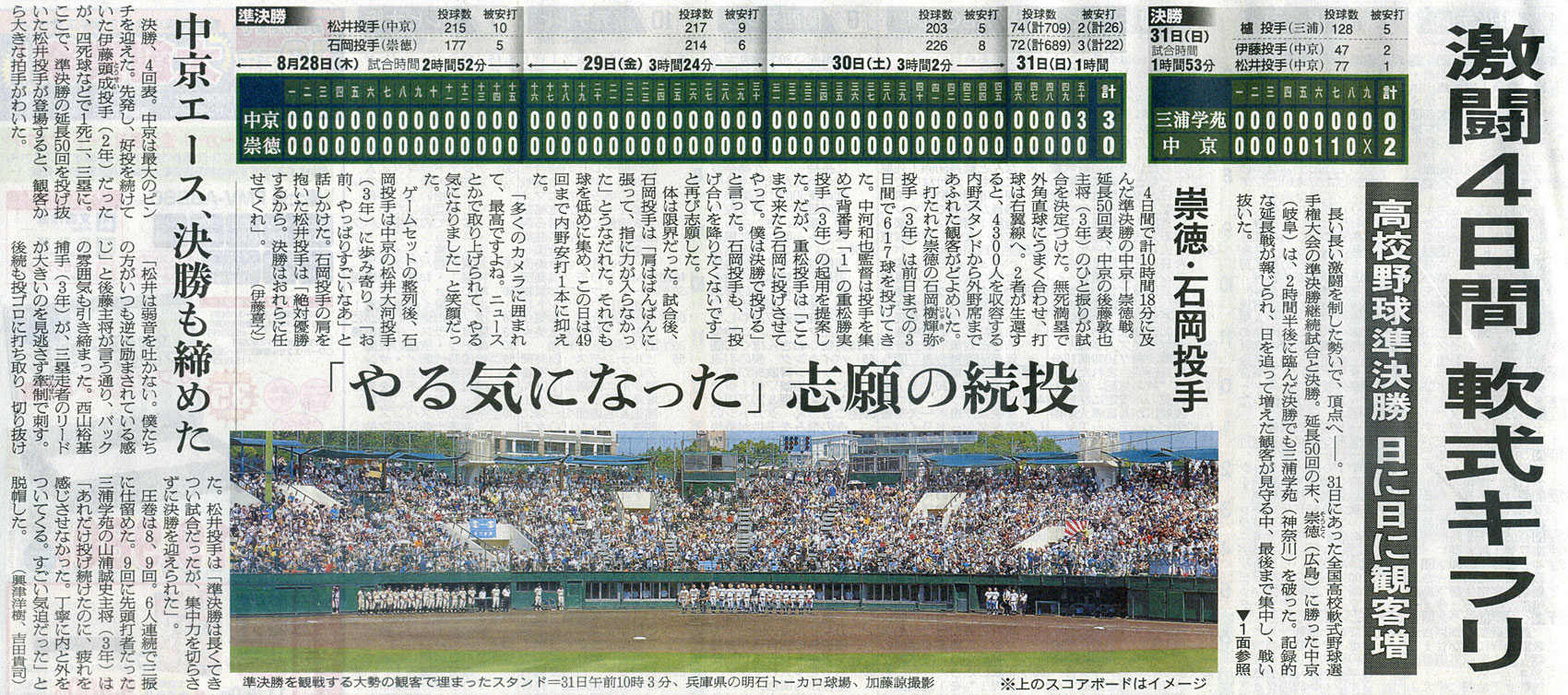 本日は朝日新聞朝刊より「激闘4日間 軟式キラリ」の記事をオススメします。
