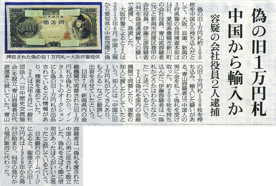 本日は朝日新聞朝刊より「偽の旧1万円札 中国から輸入か」の記事をオススメします。