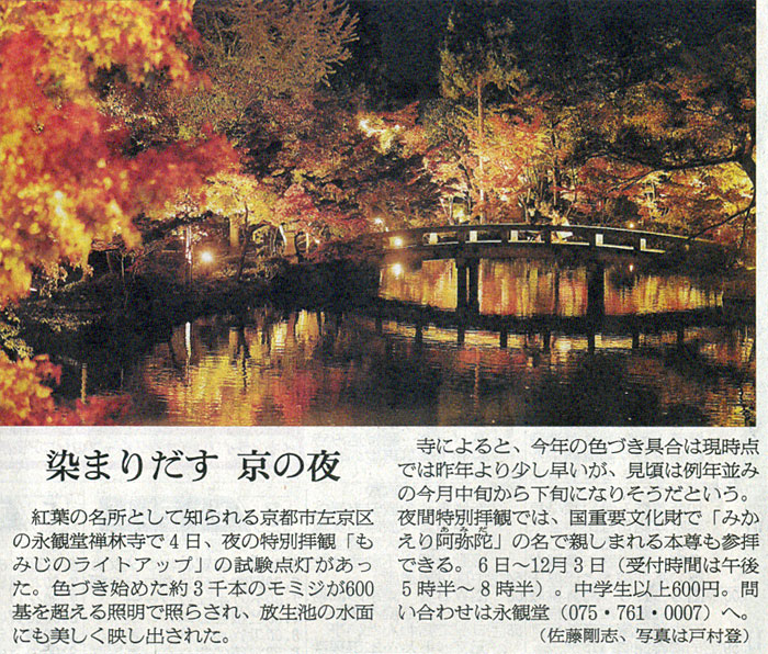 本日は朝日新聞朝刊から、「染まりだす 京の夜」の記事をオススメします。
