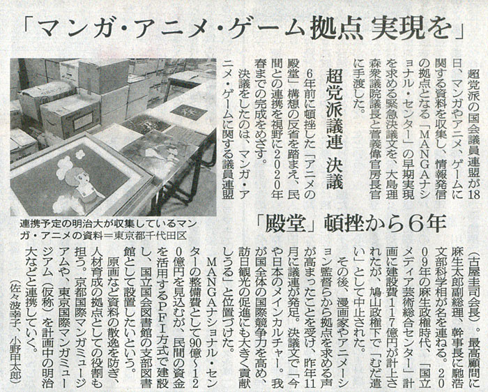 本日は朝日新聞朝刊から、「マンガ・アニメ・ゲーム拠点 実現を」の記事をオススメします。