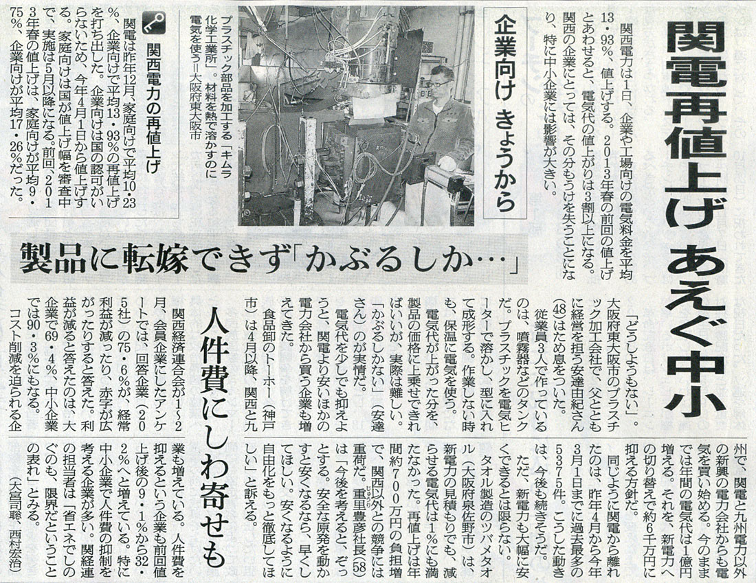 本日は朝日新聞朝刊より「関電再値上げ あえぐ中小」の記事をオススメします。