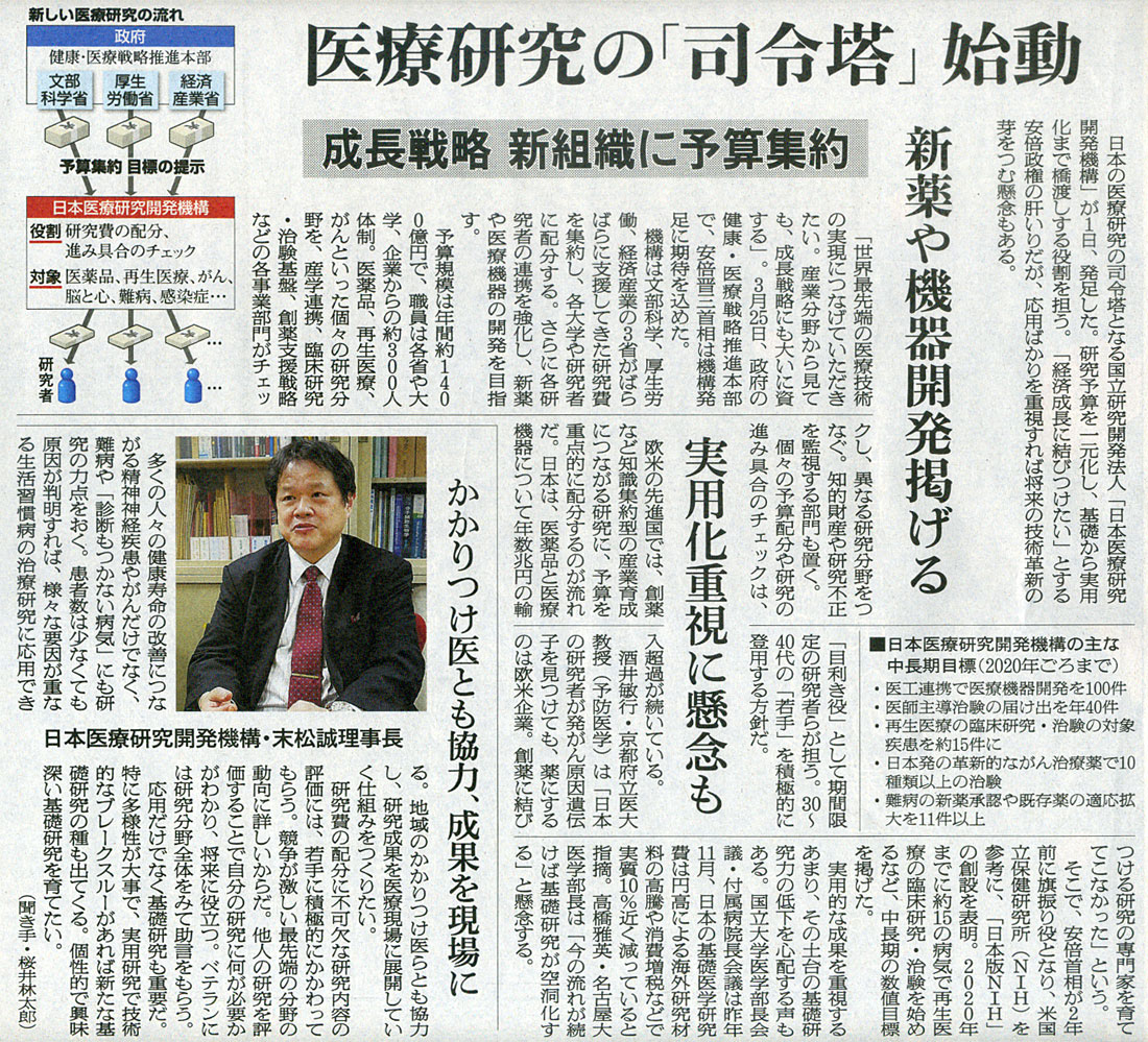 本日は朝日新聞朝刊より「医療研究の『司令塔』始動」の記事をオススメします。