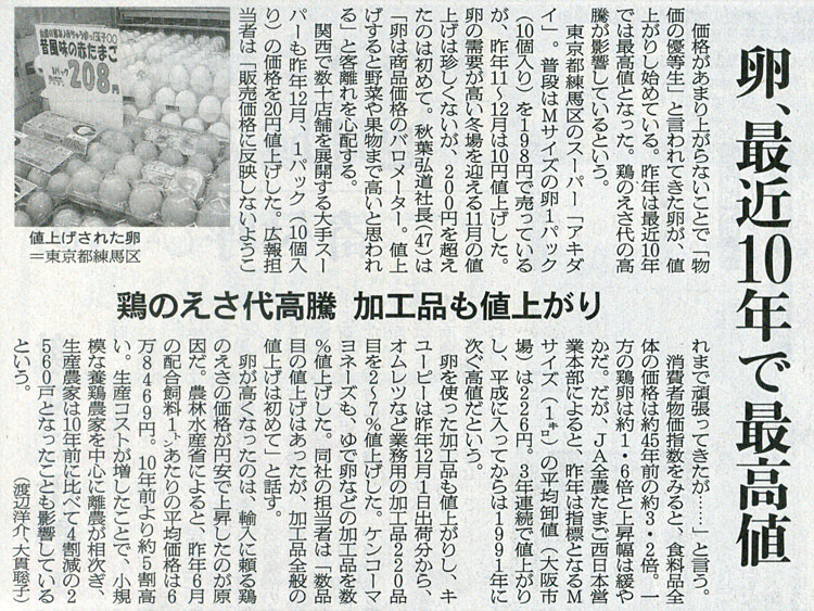 2016.1.7 ASA注目記事 カテゴリー: ピックアップ 本日は朝日新聞朝刊から、「卵、最近10年で最高値(2016年1月7日版[48175号]第38面)」の記事をオススメします。 2016年1月7日