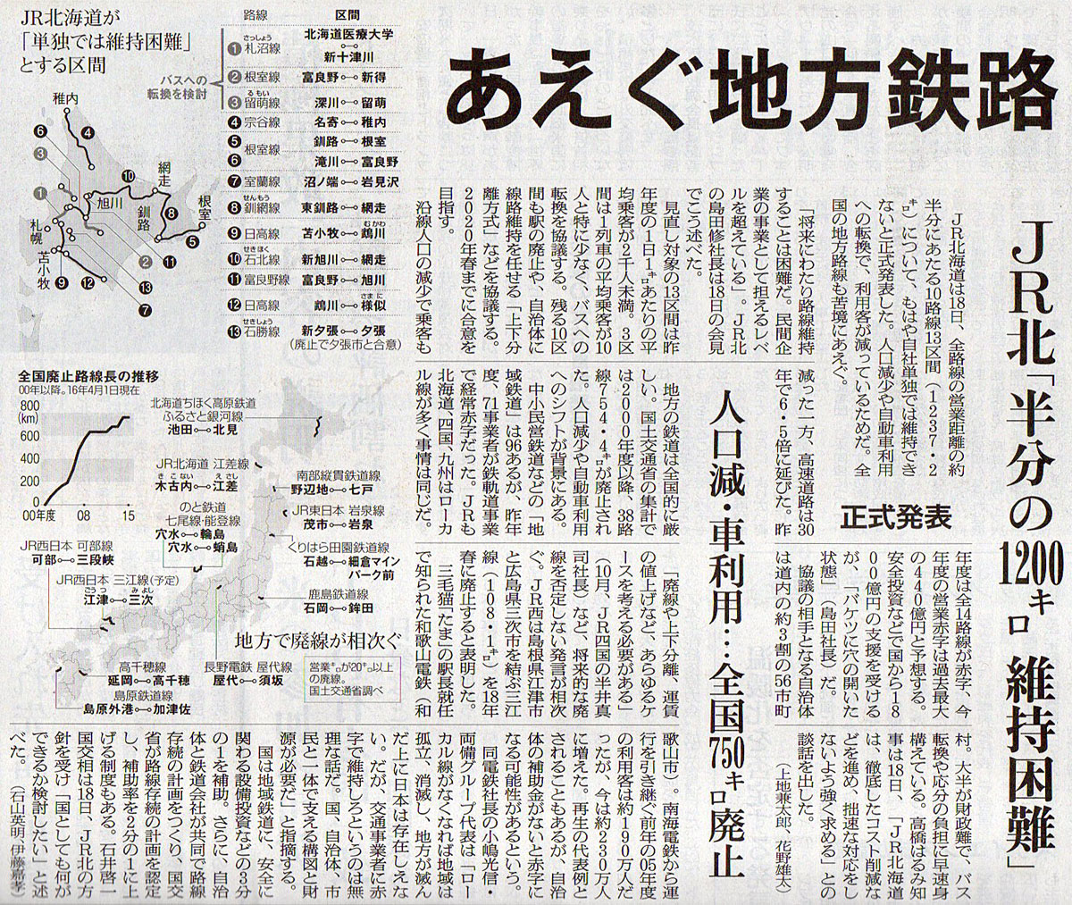 本日は朝日新聞朝刊から、「あえぐ地方鉄路(2016年11月19日版 [48484号] 第3面)」の記事をオススメします。