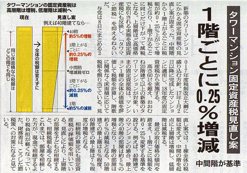 本日は朝日新聞朝刊から、「タワーマンション固定資産税見直し案 1階ごとに0.25%増減(2016年12月6日版 [48501号] 第7面)」の記事をオススメします。