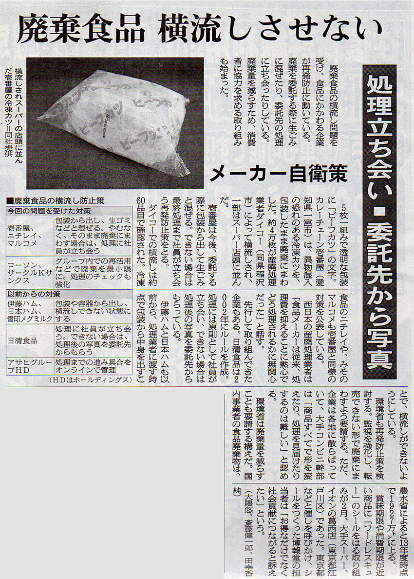2016.3.8 ASA注目記事 カテゴリー: ピックアップ 本日は朝日新聞朝刊から、「廃棄食品 横流しさせない(2016年3月8日版 [48235号] 第7面)」の記事をオススメします。 2016年3月8日