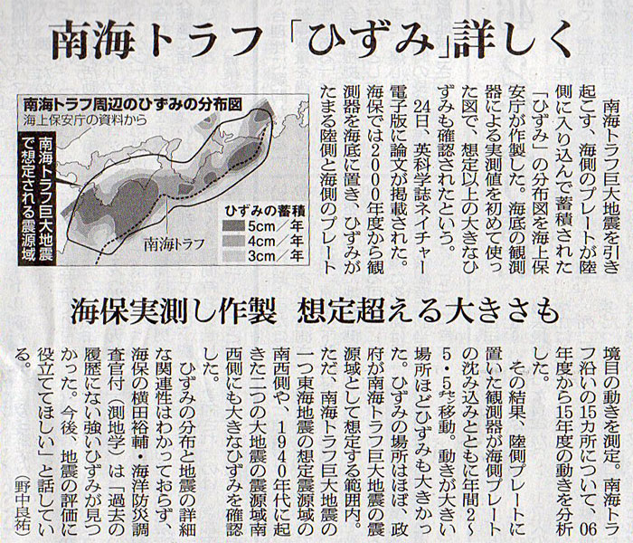 2016.5.24 ASA注目記事 カテゴリー: ピックアップ 本日は朝日新聞朝刊から、「南海トラフ 『ひずみ』詳しく(2016年5月24日版 [48310号] 第31面)」の記事をオススメします。 2016年5月24日