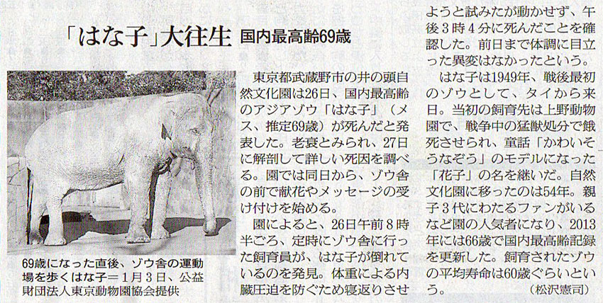 本日は朝日新聞朝刊から、「『はな子』大往生 国内最高齢69歳(2016年5月27日版 [48313号] 第30面)」の記事をオススメします。