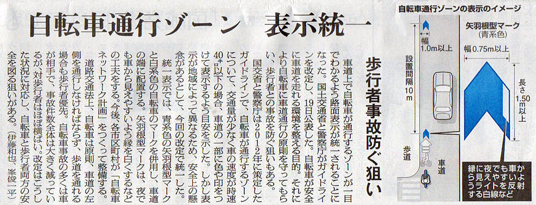 2016.7.20 ASA注目記事 カテゴリー: ピックアップ 本日は朝日新聞朝刊から、「自転車通行ゾーン 表示統一(2016年7月20日版 [48365号] 第1面)」の記事をオススメします。 2016年7月20日