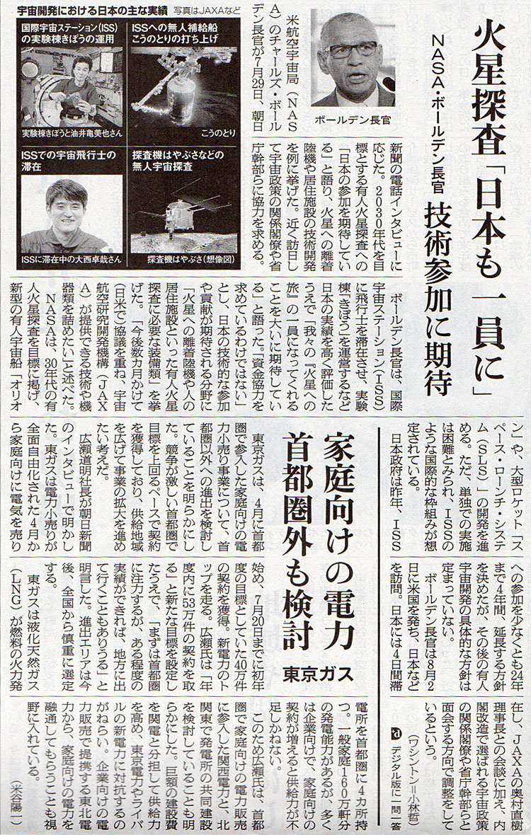 2016.8.1 ASA注目記事 カテゴリー: ピックアップ 本日は朝日新聞朝刊から、「火星探査『日本も一員に』 2016年8月1日版 [48377号] 第3面)」の記事をオススメします。 2016年8月1日