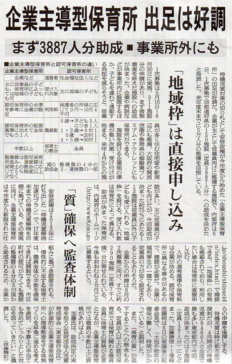 2016.9.7 ASA注目記事 カテゴリー: ピックアップ 本日は朝日新聞朝刊から、「企業主導型保育所 出足は好調(2016年9月7日版 [48414号] 第3面)」の記事をオススメします。 2016年9月7日