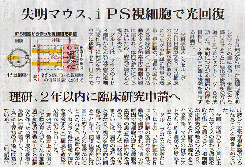 2017.1.11 ASA注目記事 カテゴリー: ピックアップ 本日は朝日新聞朝刊から、「失明マウス、iPS視細胞で光回復(2017年1月11日版 [48535号] 第1面)」の記事をオススメします。 2017年1月11日