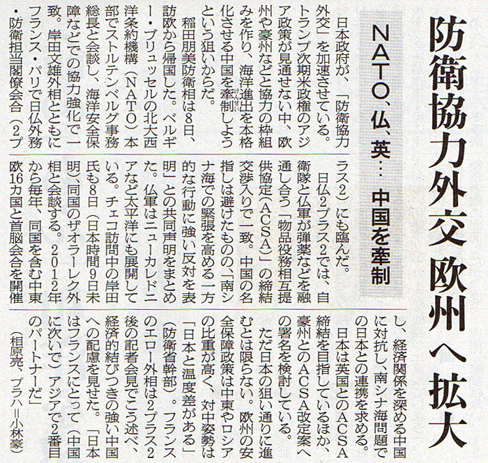2017.1.9 ASA注目記事 カテゴリー: ピックアップ 本日は朝日新聞朝刊から、「防衛協力外交 欧州へ拡大(2017年1月9日版 [48533号] 第3面)」の記事をオススメします。 2017年1月9日