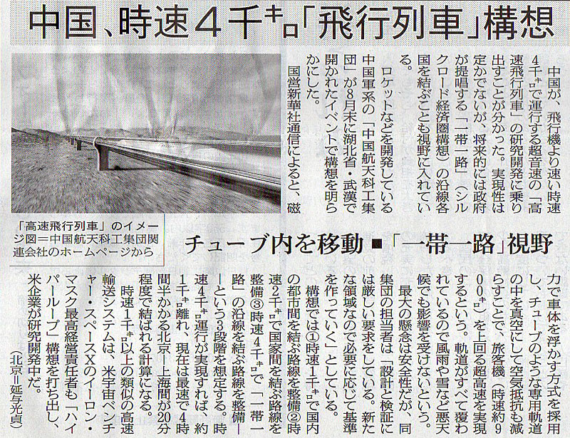 2017.10.1 ASA注目記事 カテゴリー: ピックアップ 本日は朝日新聞朝刊から、「中国、時速4千キロ『飛行列車』構想(2017年10月01日版 [48792号] 第7面)」の記事をオススメします。 2017年10月1日