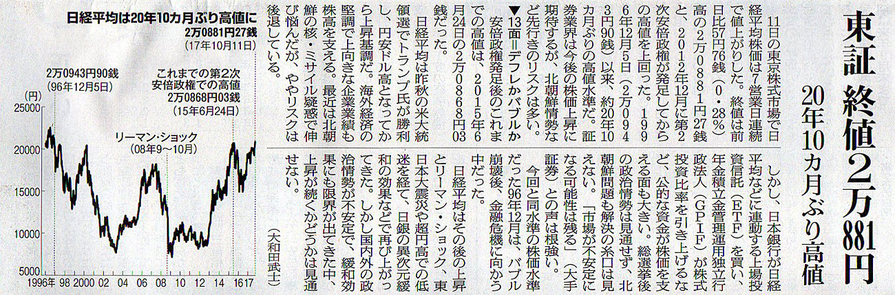2017.10.12 ASA注目記事 カテゴリー: ピックアップ 本日は朝日新聞朝刊から、「東証 終値2万881円(2017年10月12日版 [48802号] 第3面)」の記事をオススメします。 2017年10月12日