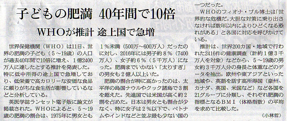 2017.10.14 ASA注目記事 カテゴリー: ピックアップ 本日は朝日新聞朝刊から、「子どもの肥満 40年間で10倍(2017年10月14日版 [48804号] 第7面)」の記事をオススメします。 2017年10月14日