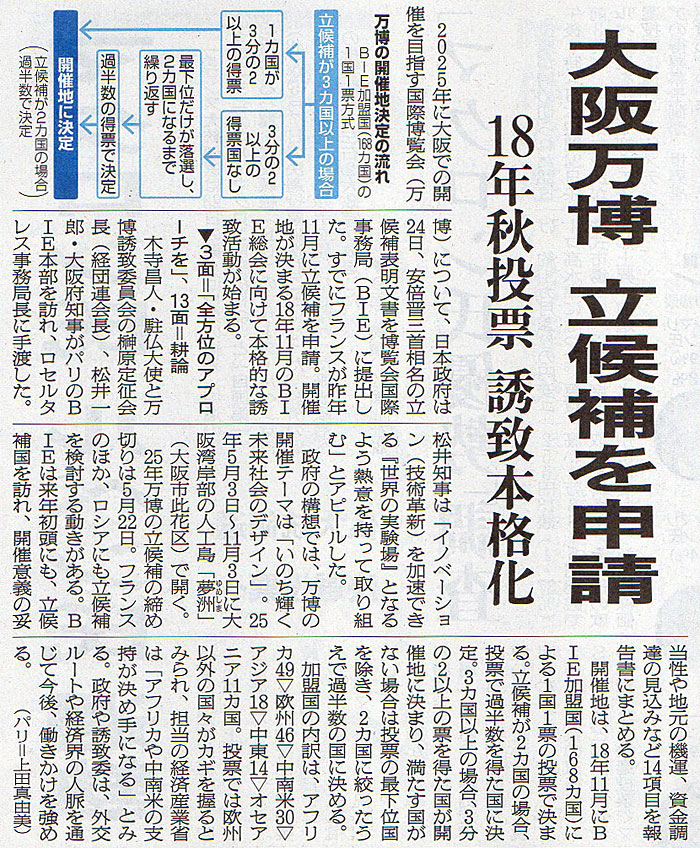 2017.4.25 ASA注目記事 カテゴリー: ピックアップ 本日は朝日新聞朝刊から、「大阪万博 立候補を申請(2017年4月25日版 [48637号] 第1面)」の記事をオススメします。 2017年4月25日