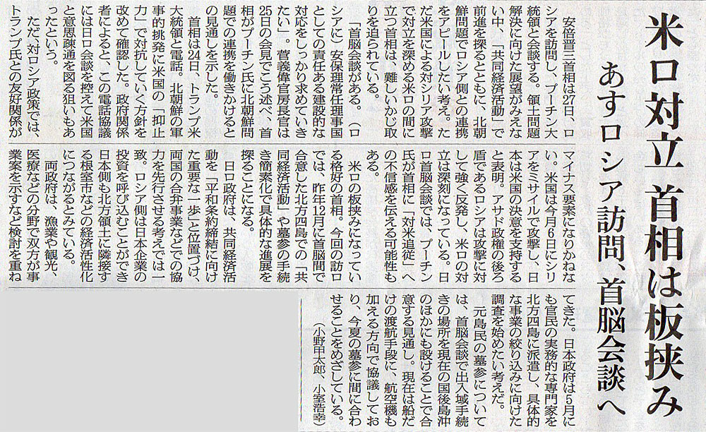 2017.4.26 ASA注目記事 カテゴリー: ピックアップ 本日は朝日新聞朝刊から、「米ロ対立 首相は板挟み(2017年4月26日版 [48638号] 第4面)」の記事をオススメします。 2017年4月26日