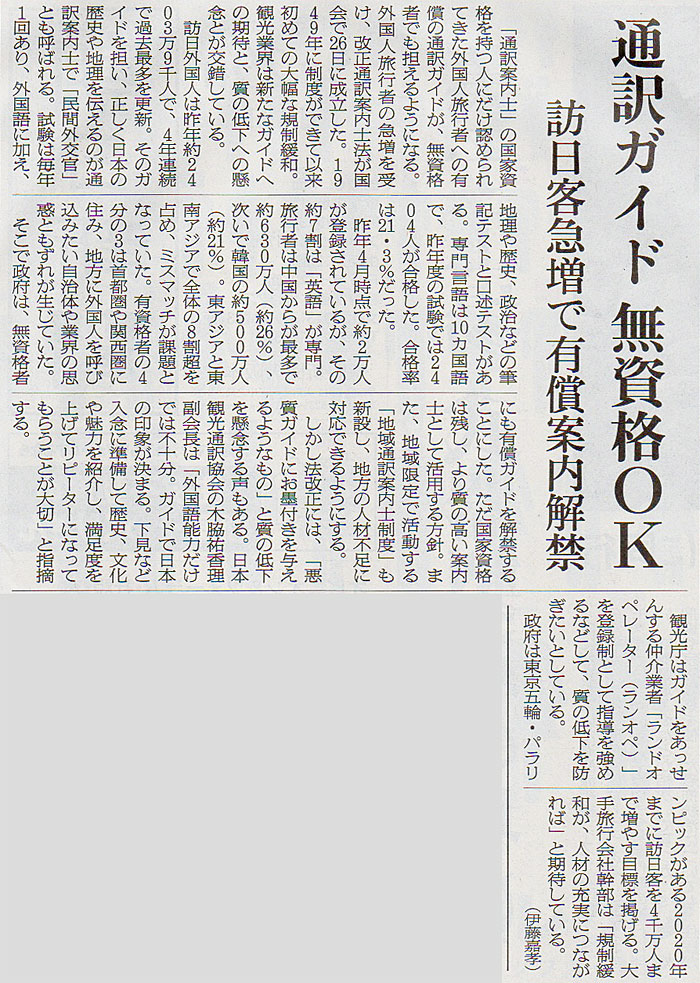 本日は朝日新聞朝刊から、「通訳ガイド 無資格OK(2017年5月29日版 [48670号] 第2面)」の記事をオススメします。