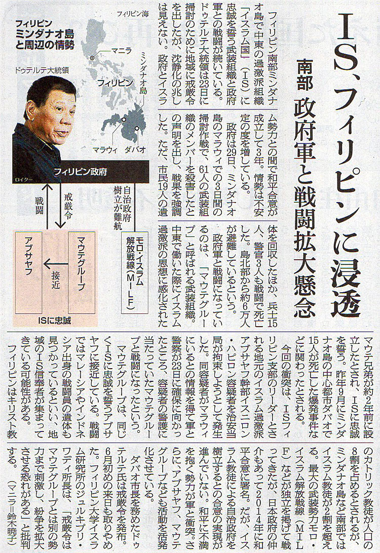 2017.5.30 ASA注目記事 カテゴリー: ピックアップ 本日は朝日新聞朝刊から、「IS、フィリピンに浸透(2017年5月30日版 [48671号] 第9面)」の記事をオススメします。 2017年5月30日