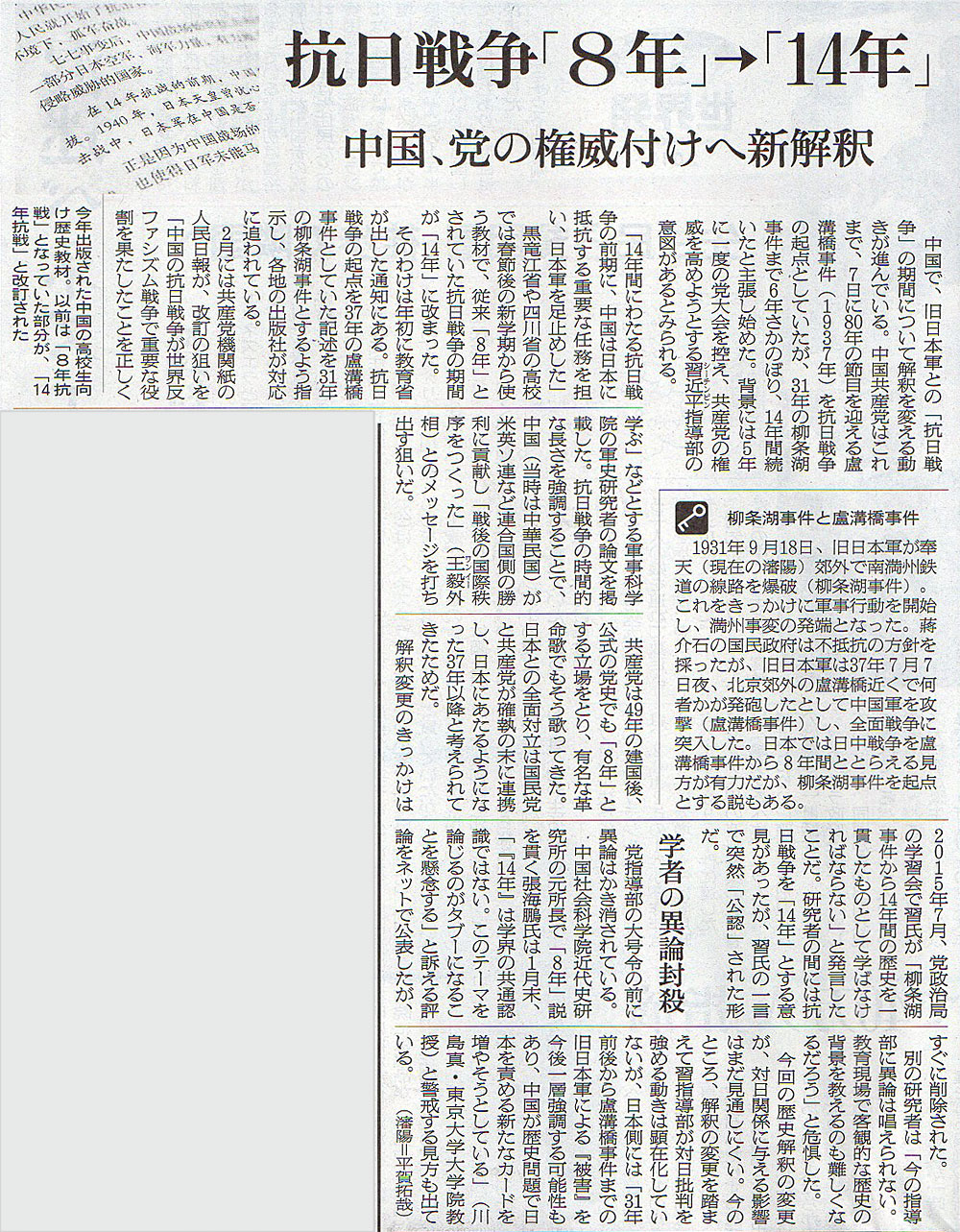 2017.7.3 ASA注目記事 カテゴリー: ピックアップ 本日は朝日新聞朝刊から、「抗日戦争『8年』→『14年』 中国、党の権威付けへ新解釈(2017年7月3日版 [48704号] 第7面)」の記事をオススメします。 2017年7月3日