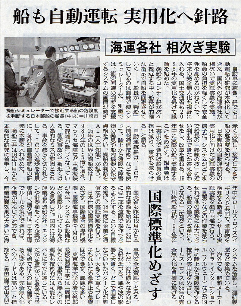 2018.1.10 ASA注目記事 カテゴリー: ピックアップ 本日は朝日新聞朝刊から、「船も自動運転 実用化へ針路(2018年01月10日版 [48889号] 第5面)」の記事をオススメします。 2018年1月10日