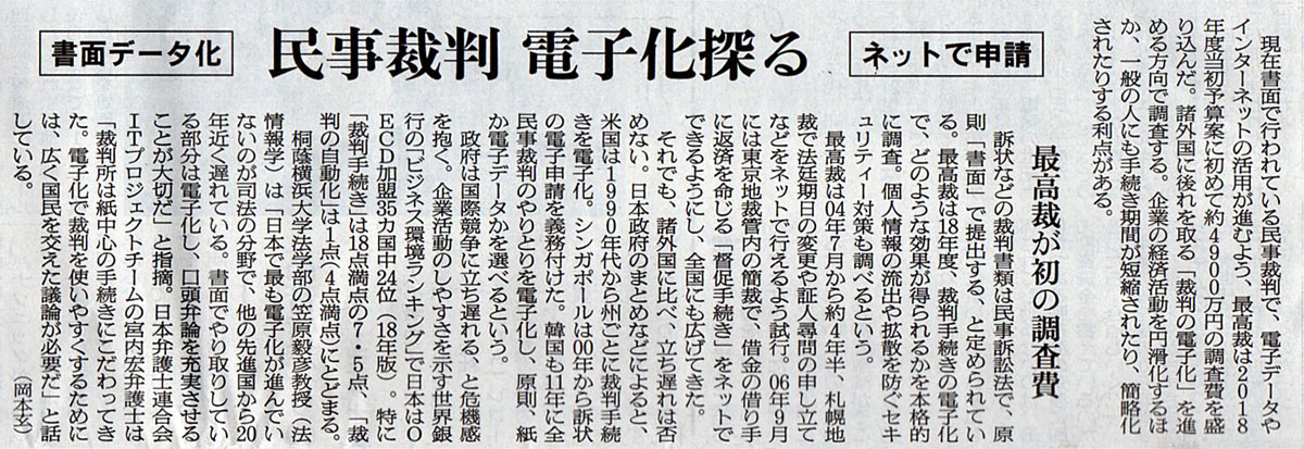 2018.1.9 ASA注目記事 カテゴリー: ピックアップ 本日は朝日新聞朝刊から、「民事裁判 電子化探る(2018年01月09日版 [48888号] 第3面)」の記事をオススメします。 2018年1月9日