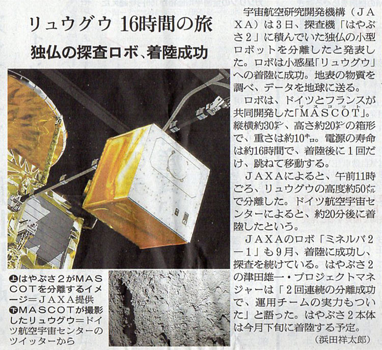 本日は朝日新聞朝刊から、「リュウグウ 16時間の旅 独仏の探査ロボット、着陸成功(2018年10月4日版 [49149号] 5面)」の記事をオススメします。
