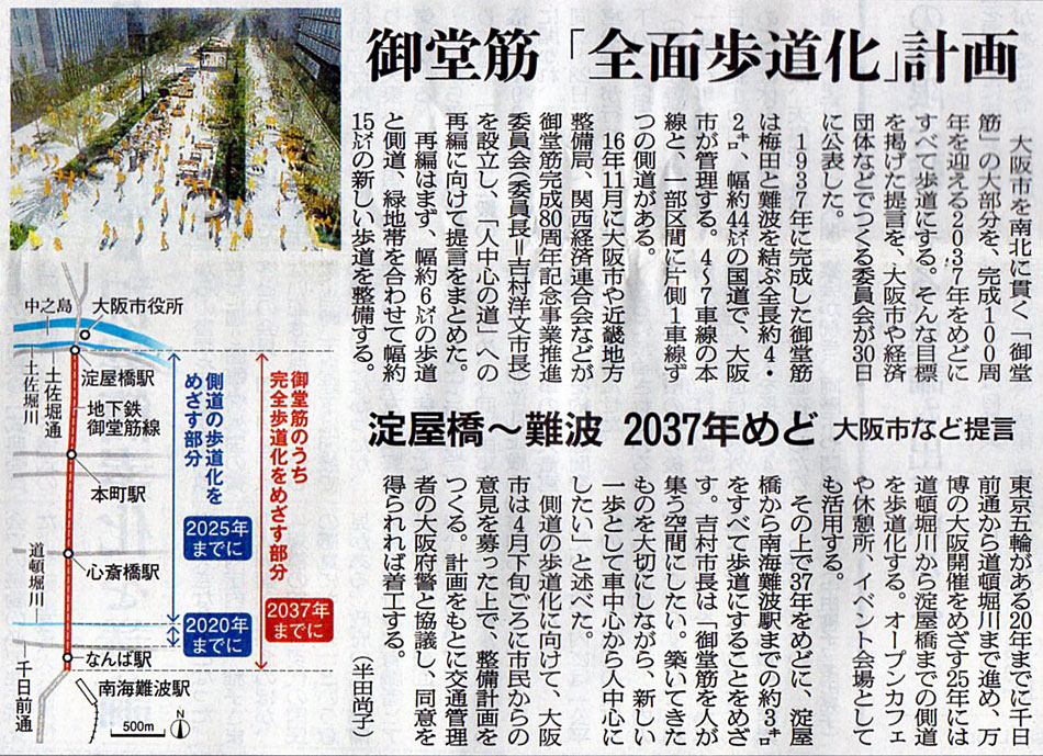 2018.3.31 ASA注目記事 カテゴリー: ピックアップ 本日は朝日新聞朝刊から、「御堂筋『全面歩道化』計画(2018年3月31日版 [48968号] 1面)」の記事をオススメします。 2018年3月31日
