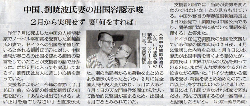 2018.5.4 ASA注目記事 カテゴリー: ピックアップ 本日は朝日新聞朝刊から、「中国、劉曉波氏妻の出国容認示唆(2018年5月4日版 [49001号] 7面)」の記事をオススメします。 2018年5月4日