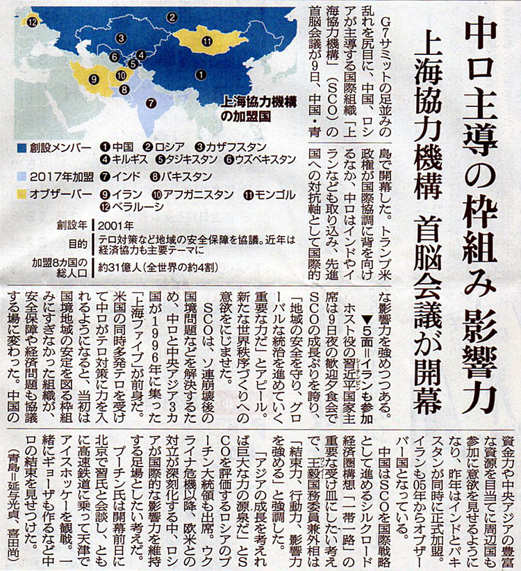 2018.6.10 ASA注目記事 カテゴリー: ピックアップ 本日は朝日新聞朝刊から、「中ロ主導の枠組み影響力(2018年6月10日版 [49037号] 2面)」の記事をオススメします。 2018年6月10日
