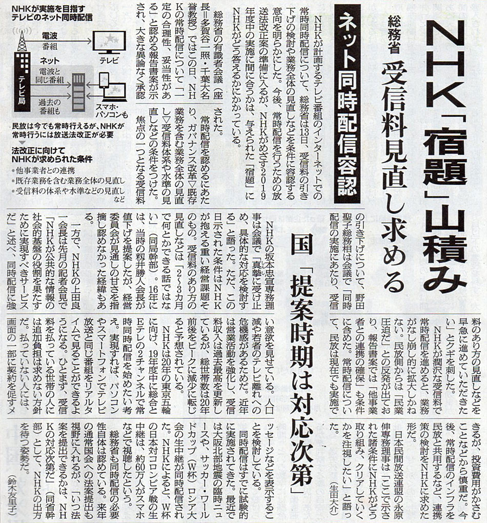 2018.7.14 ASA注目記事 カテゴリー: ピックアップ 本日は朝日新聞朝刊から、「NHK『宿題』山積み(2018年7月14日版 [49069号] 8面)」の記事をオススメします。 2018年7月14日