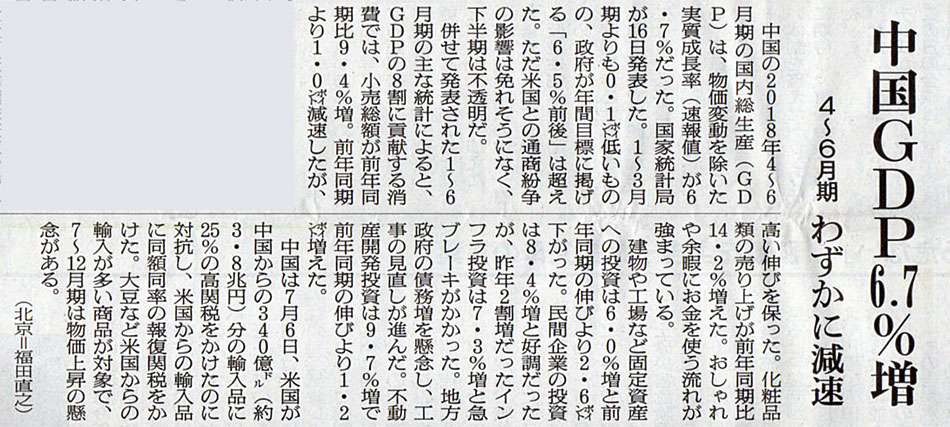 2018.7.17 ASA注目記事 カテゴリー: ピックアップ 本日は朝日新聞朝刊から、「中国GDP6.7%増(2018年7月17日版 [49072号] 4面)」の記事をオススメします。 2018年7月17日