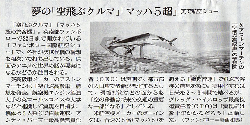 本日は朝日新聞朝刊から、「夢の『空飛ぶクルマ』『マッハ5超』 英で航空ショー(2018年7月22日版 [49077号] 5面)」の記事をオススメします。