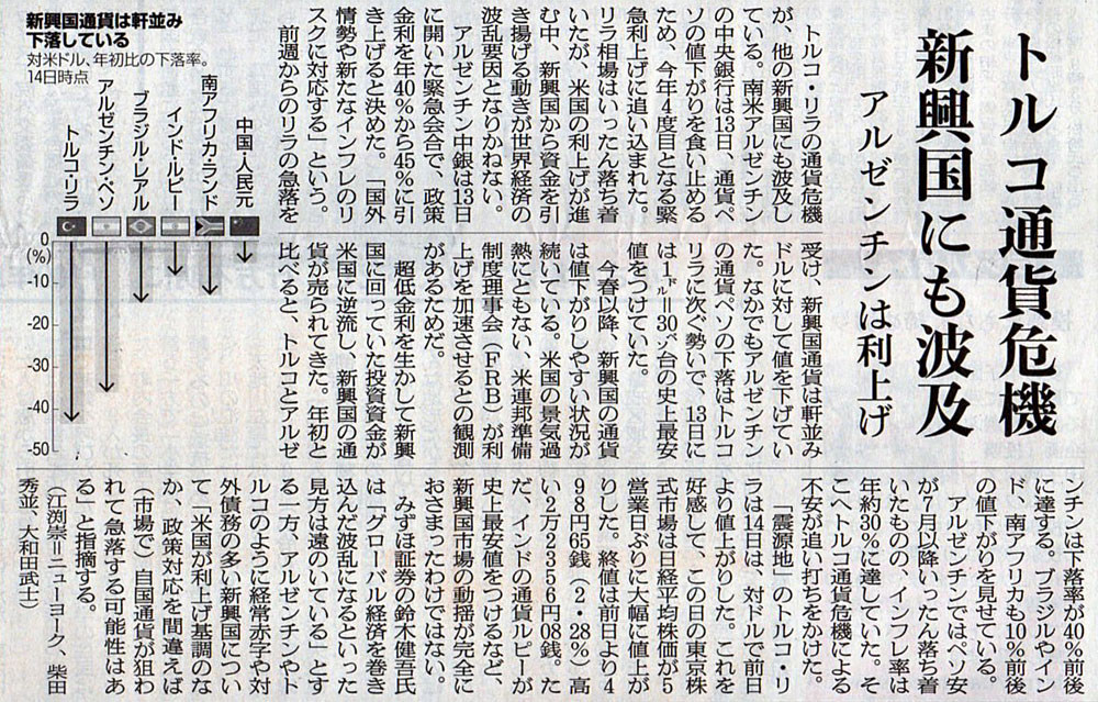 本日は朝日新聞朝刊から、「トルコ通貨危機 新興国にも波及(2018年8月15日版 [49100号] 4面)」の記事をオススメします。