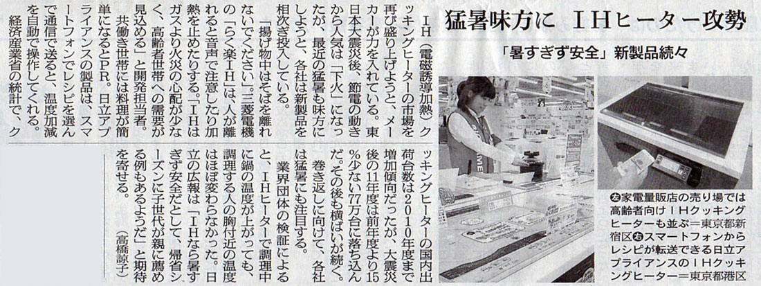 本日は朝日新聞朝刊から、「猛暑味方に IHヒーター攻勢(2018年8月16日版 [49101号] 4面)」の記事をオススメします。