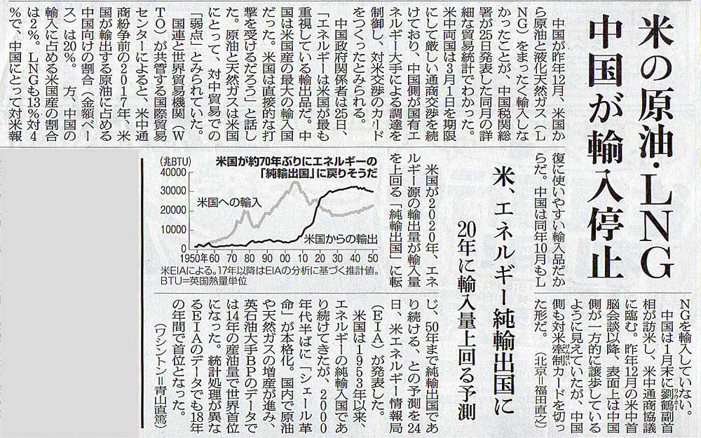 2019.1.26 スタッフ注目記事 カテゴリー: ピックアップ 本日は朝日新聞朝刊から、「米の原油・LNG 中国が輸入停止(2019年1月26日版 [49259号] 8面)」の記事をオススメします。 2019年1月26日