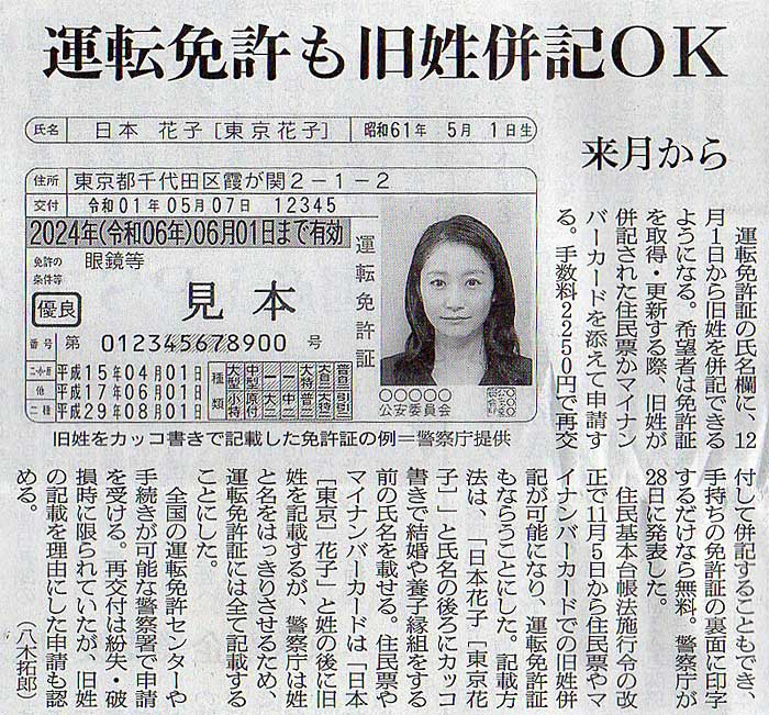 2019.11.29 スタッフ注目記事 カテゴリー: ピックアップ 本日は朝日新聞朝刊から、「運転免許も旧姓併記OK(2019年11月29日版 [649556号] 3面)」の記事をオススメします。 2019年11月29日
