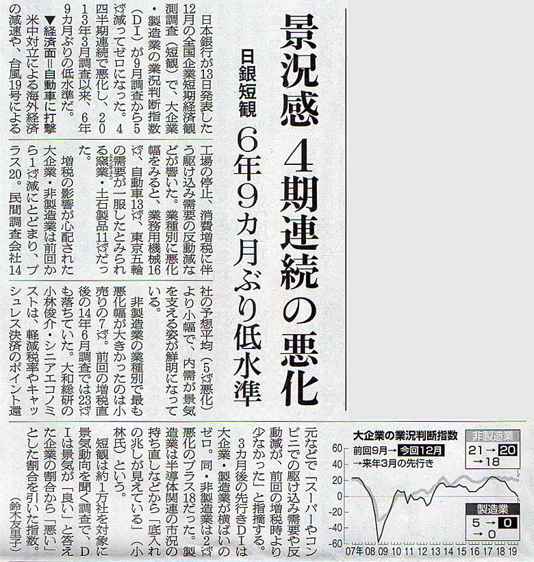 本日は朝日新聞朝刊から、「景況感 4期連続の悪化(2019年12月14日版 [649570号] 3面)」の記事をオススメします。