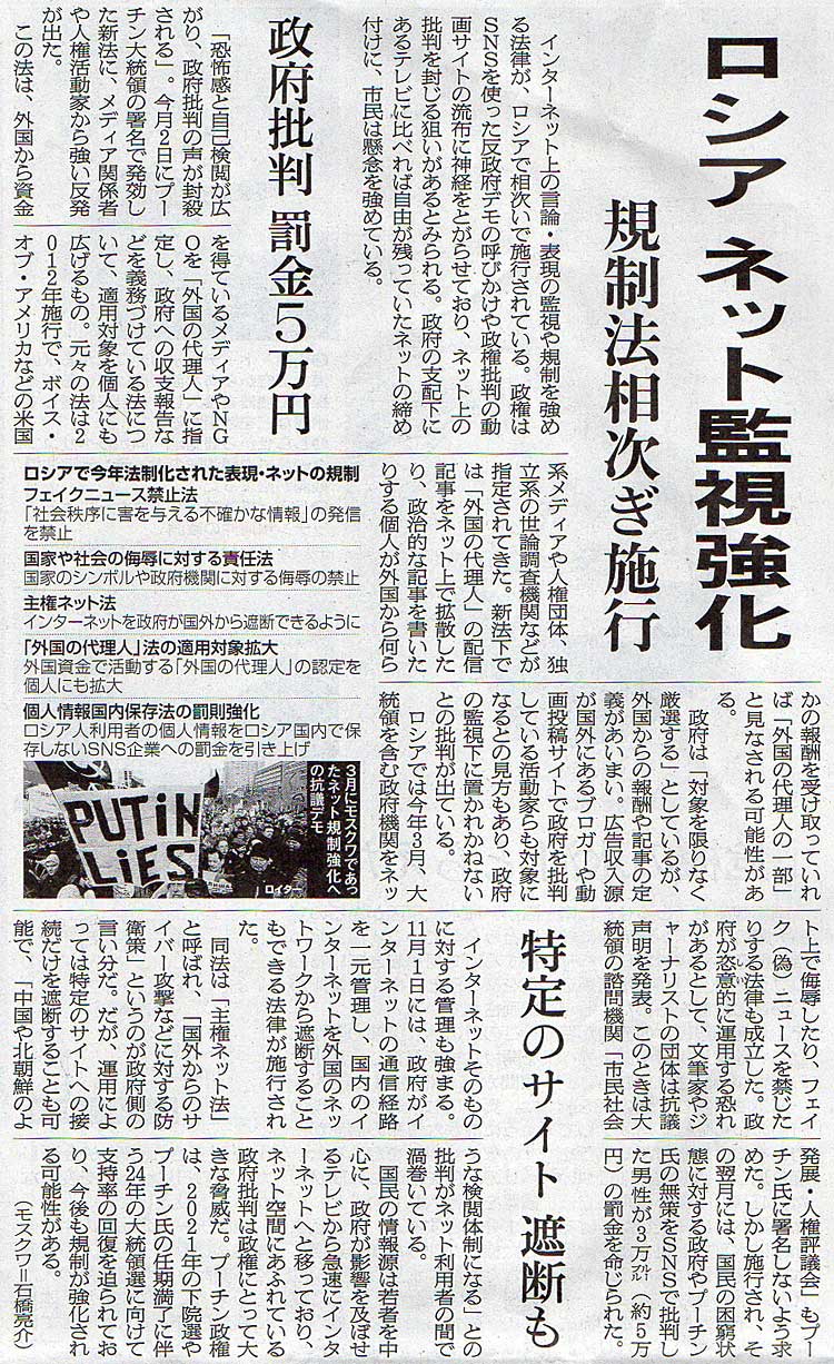 本日は朝日新聞朝刊から、「ロシア ネット監視強化(2019年12月16日版 [649572号] 4面)」の記事をオススメします。