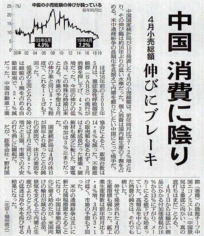 2019.5.16 スタッフ注目記事 カテゴリー: ピックアップ 本日は朝日新聞朝刊から、「中国 消費に陰り(2019年5月16日版 [49365号] 7面)」の記事をオススメします。 2019年5月16日